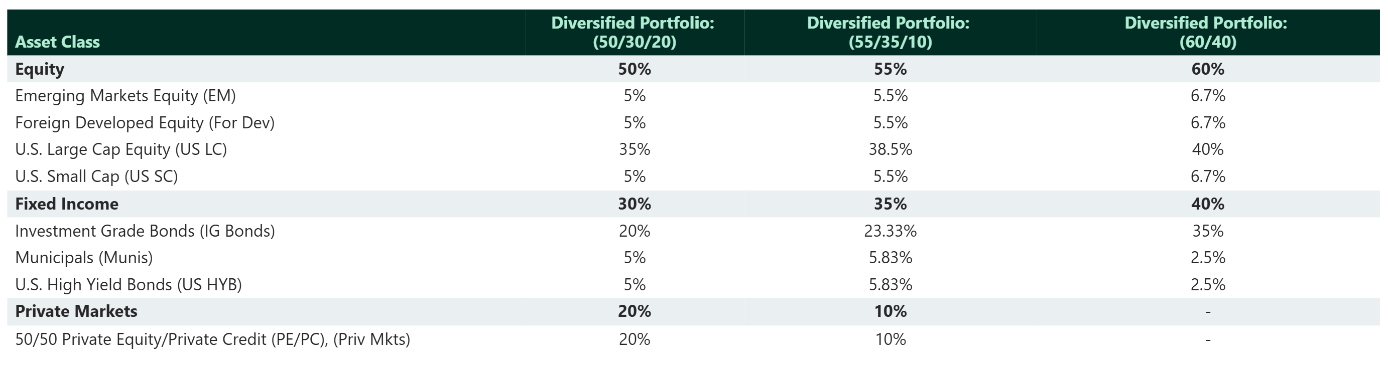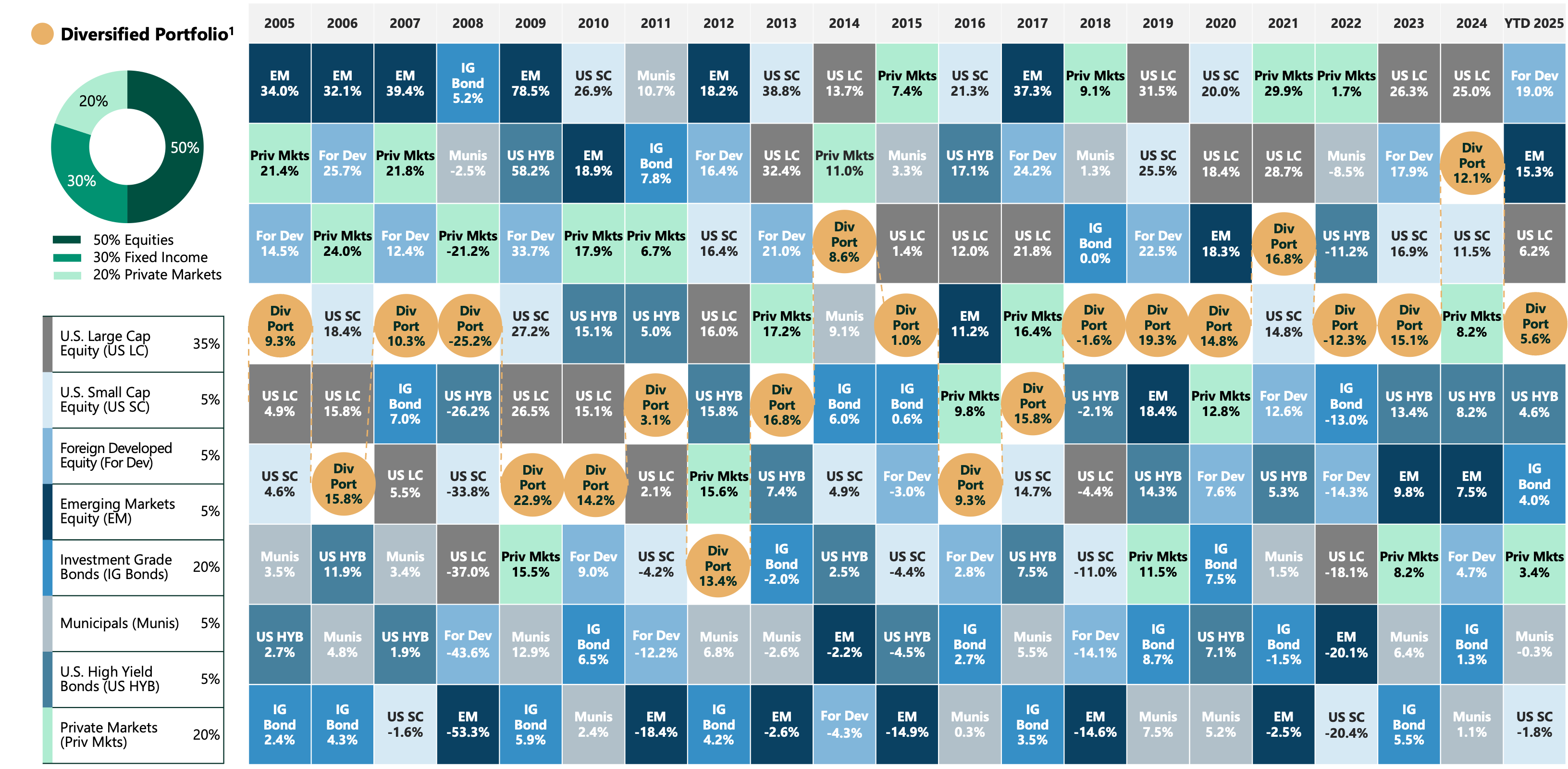 Sources: Bloomberg, Dow Jones, FactSet, MSCI, Preqin, Russell, Standard & Poor’s as of June 30, 2025. The Diversified Portfolio is rebalanced to the original allocation annually. Please note that the Diversified Portfolio is not an investable product and the performance information of the Diversified Portfolio is not those any AMG funds, strategies, or other investment products. See disclosures for representative indices and their definitions. The indices are unmanaged, are not available for investment, and do not incur expenses. Past performance is no guarantee of future results.